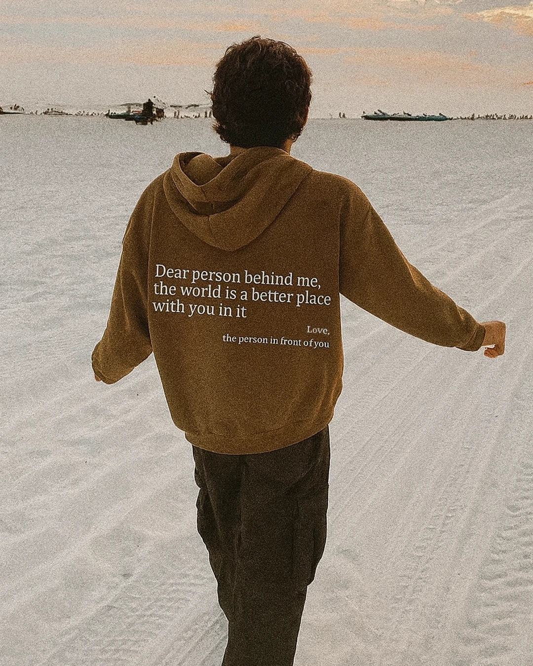 Featuring the heartwarming message, "Dear Person Behind Me, You Are Enough," this hoodie is a daily reminder that you are perfect just the way you are. Wear it to inspire others and create a ripple of positivity everywhere you go